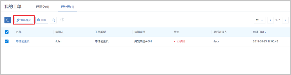 因为工单流程中成员被删除导致的John被驳回的工单将进入我的工单的已处理子页面,John需要进入此页面,勾选该工单,点击重新提交按钮,重新提交工单。如Figure 11所示: