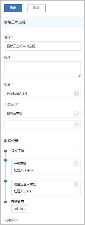 - 点击添加环节可继续添加审批环节,所有环节添加完成后,点击顶部确定按钮,完成工单流程创建