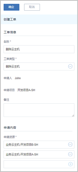 John想要删除两台云主机,因没有删除云主机权限,他决定通过工单审批的方式删除云主机。提交工单的流程如下: