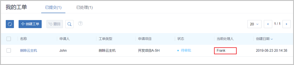 John通过上述流程创建了一个工单:删除云主机,该工单会按照自定义审批流程,首先走到Frank(一级审批),如