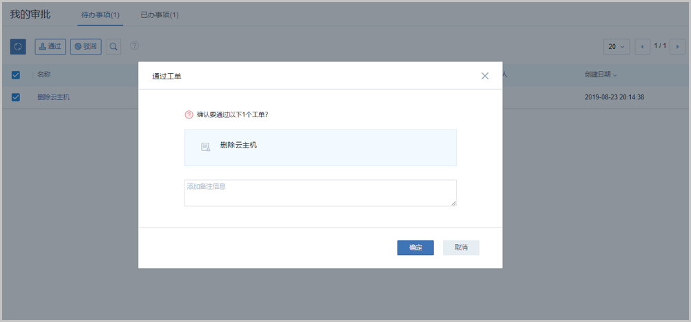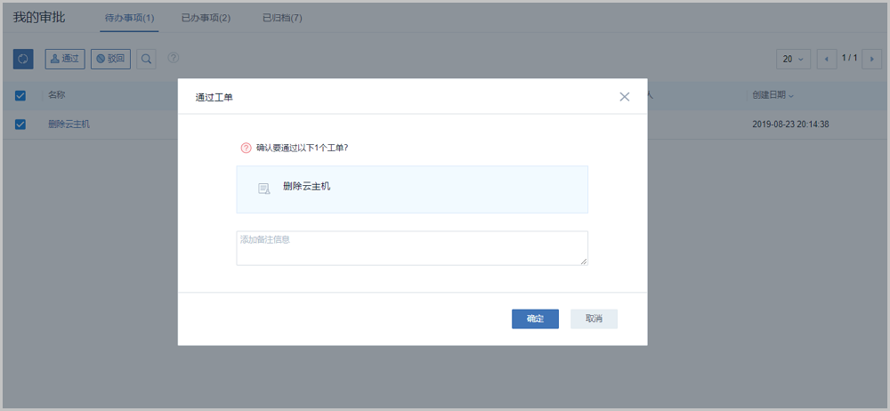 审批方式与一级审批相同。进入我的审批界面的待办事项子页面,勾选这条工单,点击通过按钮,在弹出的通过工单页面,填写备注信息,点击确定按钮,审批通过该工单。