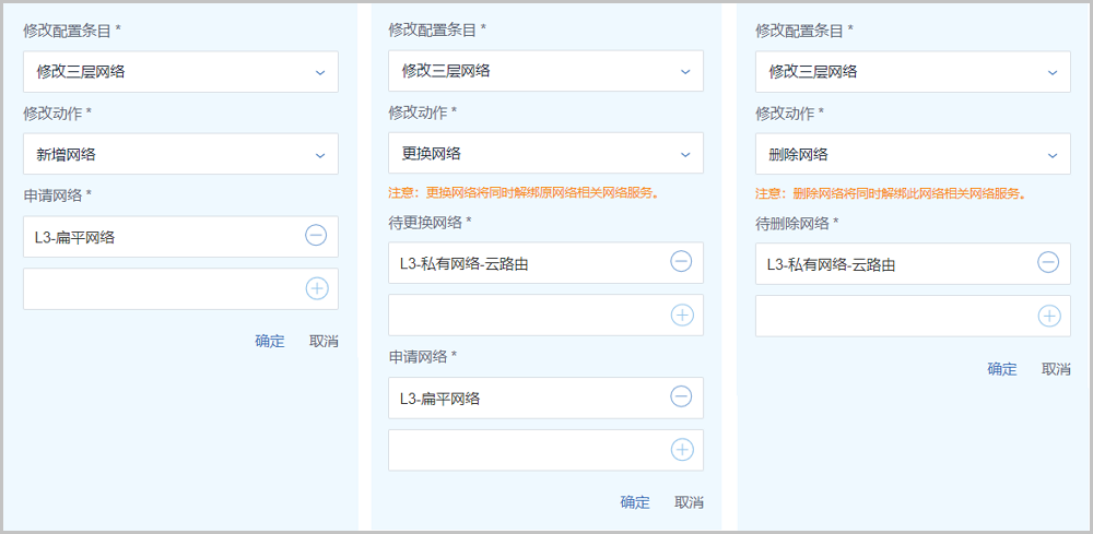 - 修改动作:选择修改动作,支持新增网络、更换网络、删除网络