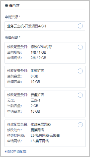 - 申请配置:添加申请配置,支持修改CPU/内存、系统扩容、云盘扩容、修改三层网络
