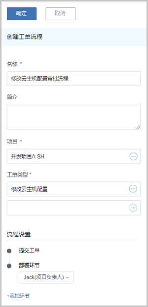 - 点击添加环节可继续添加审批环节,所有环节添加完成后,点击顶部确定按钮,完成工单流程创建