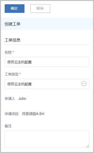 John(普通项目成员)需要对云主机配置调整,因没有修改云主机配置权限,他决定通过工单审批的方式向Jack(项目负责人)申请修改云主机配置。提交工单的流程如下: