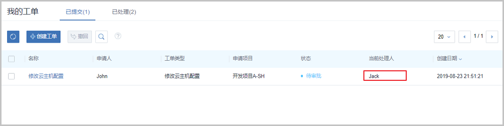 John通过上述流程创建了一个工单:修改云主机配置,该工单会按照自定义审批流程,走到Jack(项目负责人),如Figure 9所示:Figure 9. 创建工单完成