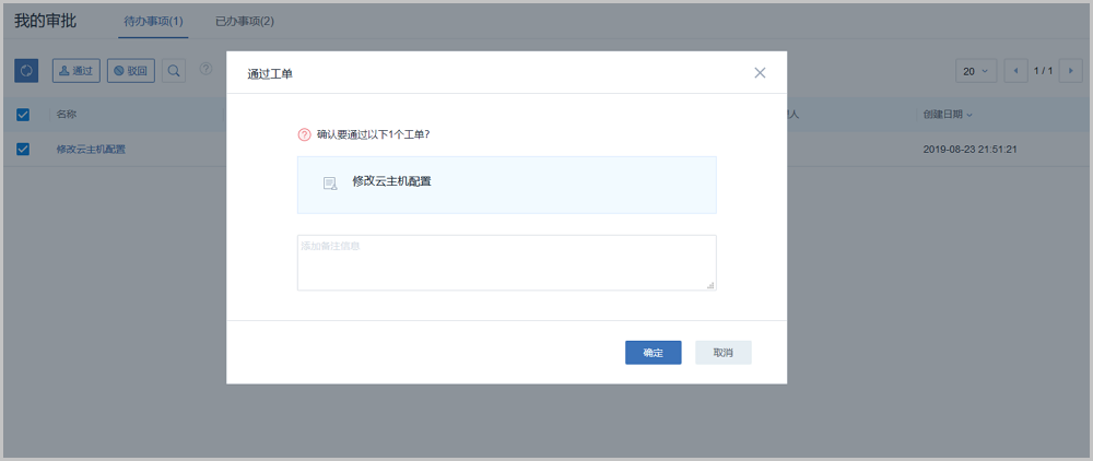 Jack从项目登录界面(http://your_machine_ip:5000/#/project)登录云平台,进入项目,在ZStack私有云主菜单,点击高级功能 > 企业管理 > 工单管理 > 我的审批按钮,在我的审批界面的待办事项子页面,勾选这条工单,点击通过按钮,在弹出的通过工单页面,填写备注信息,点击确定按钮,审批通过该工单,如Figure 10所示: 项目负责人审批通过后,修改云主机配置的申请立即生效。Figure 10. Jack通过审批