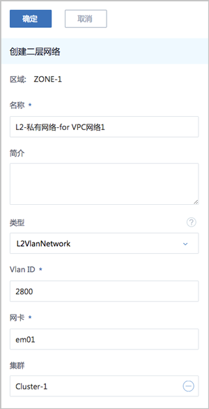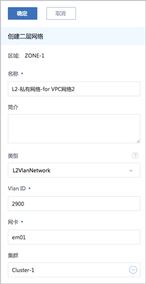 - 创建二层私有网络(用于创建三层的VPC网络1),并加载此二层网络到相应集群。