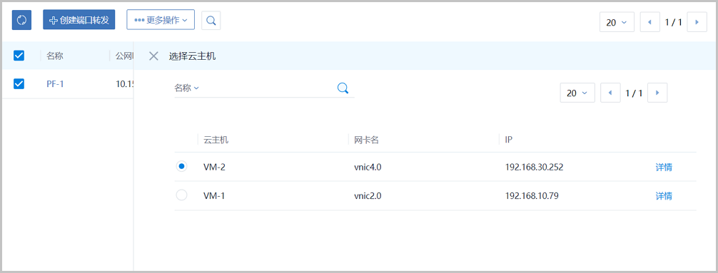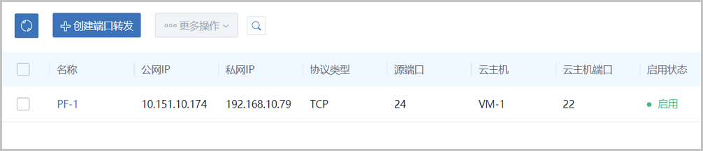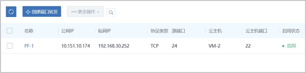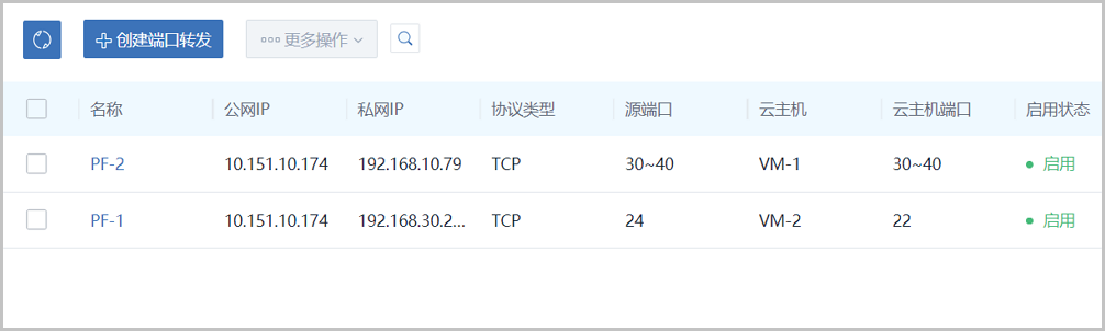 端口转发(PF):基于云路由器/VPC路由器提供的三层转发服务,可将指定公有网络的IP地址端口流量转发到云主机对应协议的端口。在公网IP地址紧缺的情况下,通过端口转发可提供多个云主机对外服务,节省公网IP地址资源。