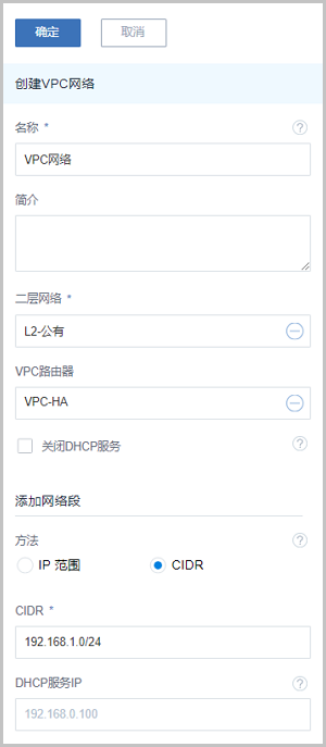Table 3. VPC网络配置信息 私有网络 配置信息 网卡 em01 VLAN ID 2800 IP CIDR 192.168.1.0/24 DHCP IP 192.168.1.2