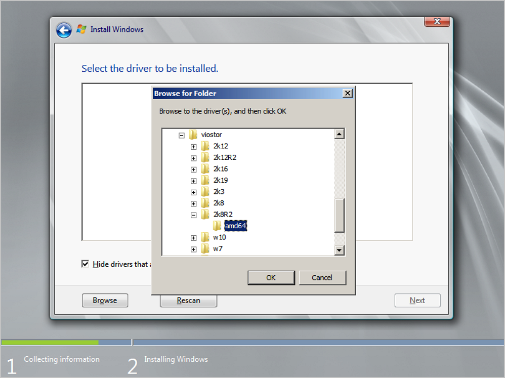 - For the 64-bit operating system, the path of the disk drive is viostor\*\amd64.
