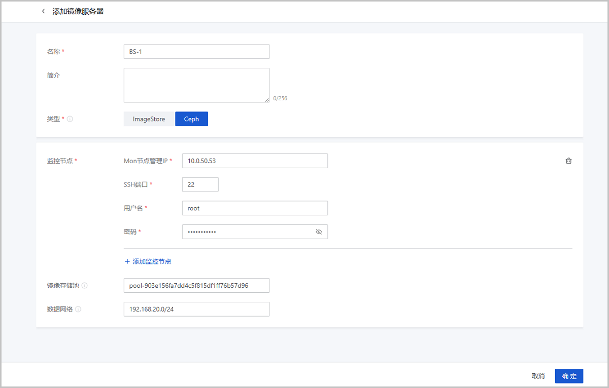 在ZStack Cube 双引擎版主菜单,点击,进入镜像服务器界面。点击添加镜像服务器,弹出添加镜像服务器界面。