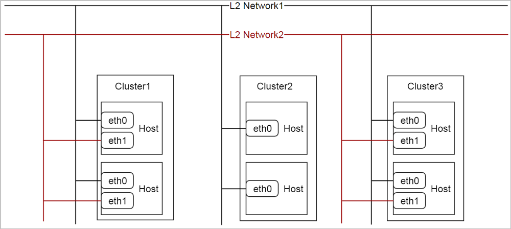 假设数据中心中的网络拓扑结构如上图所示。 所有集群中的物理主机的eth0都连接在同一个称为L2 Network1的二层网络上;集群cluster1和cluster3中物理主机的eth1都连接在另一个称为L2 network2的二层网络上。为了在ZStack Cloud中描述这个拓扑结构,可以将L2 network1挂载到所有三个集群上,同时只将L2 network2挂载到集群cluster1和cluster3上。