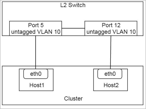 在上图这个配置中,交换机的两个端口5和12是不带VLAN 10标签(untagged VLAN 10)的端口(Cisco中的VLAN 10访问端口,即access port), 并且分别连接到host1和host2的eth0。 这对于L2NoVlanNetwork是一个有效的配置。 管理员可以使用physicalInterface = eth0创建L2NoVlanNetwork,并挂载到集群。