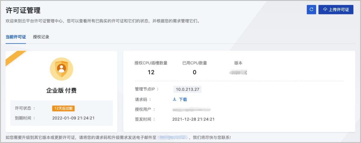 | 许可证已过期 | 当平台许可证已过期,登录云平台后将自动跳转至许可证管理界面。为不影响您的正常使用,请尽快联系云平台相关服务人员进行授权更新,以继续使用本产品。 说明: