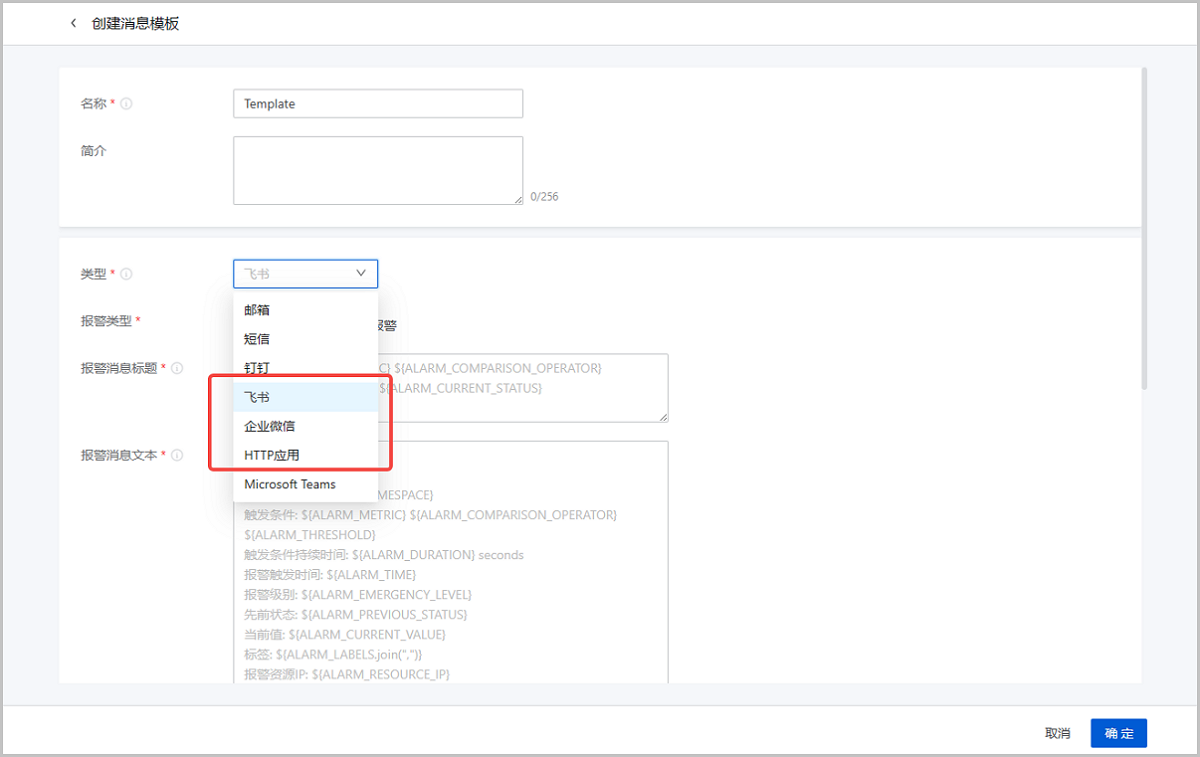 如不自定义消息模板,HTTP应用/企业微信/飞书报警消息将按系统自带的模板发出。