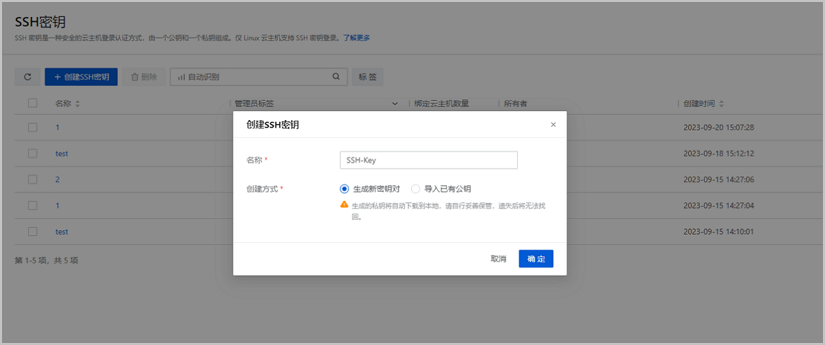 用户可在该界面点击创建SSH密钥,直接生成新密钥对,或将已有的SSH公钥导入云平台管理。