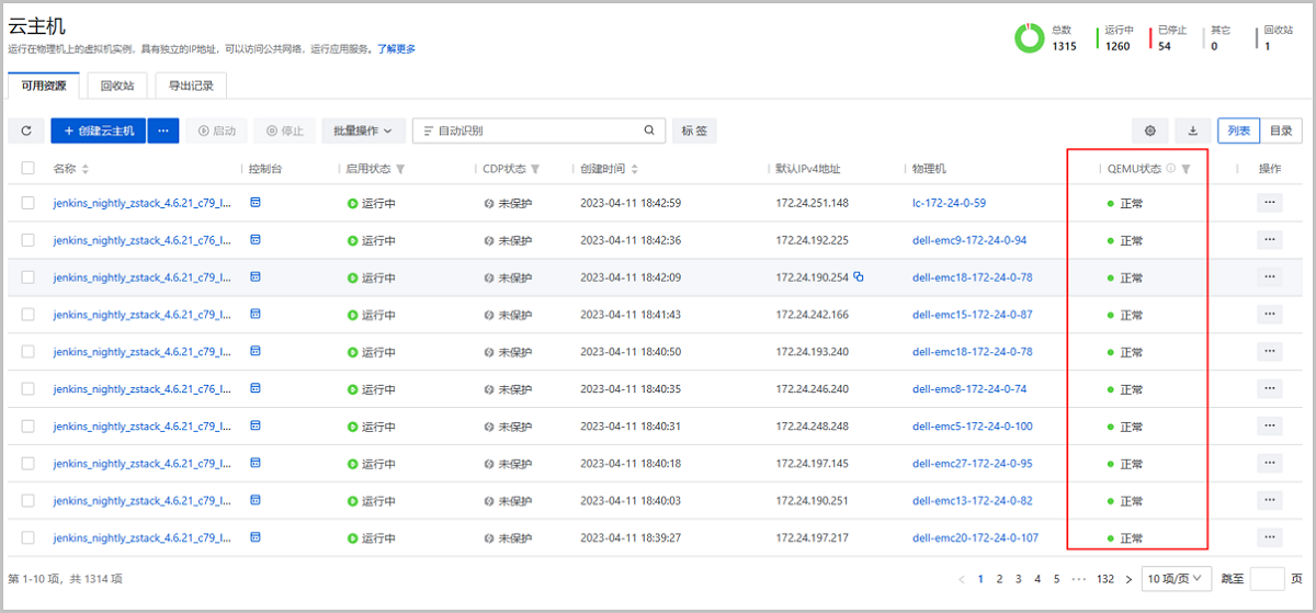 ZStack Cloud 4.6.21开始,云主机/VPC路由器主列表新增QEMU状态列,用于展示云主机/VPC路由器的QEMU版本信息。云主机/VPC路由器QEMU版本与所属物理机不一致时,QEMU状态将显示为待更新,用户可通过迁移或重启云主机/VPC路由器更新其QEMU版本至与物理机一致。同时,云主机/VPC路由器资源支持按QEMU状态筛选,用户可筛选全部QEMU状态为待更新的资源,一键重启,完成资源QEMU批量更新。
