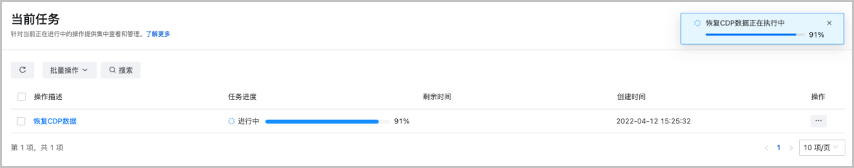 新增支持“恢复CDP数据”长时任务,准确监控恢复进度,并以可视化的方式进行展现。同时该任务支持取消,且恢复过程中产生的中间数据不会保留。