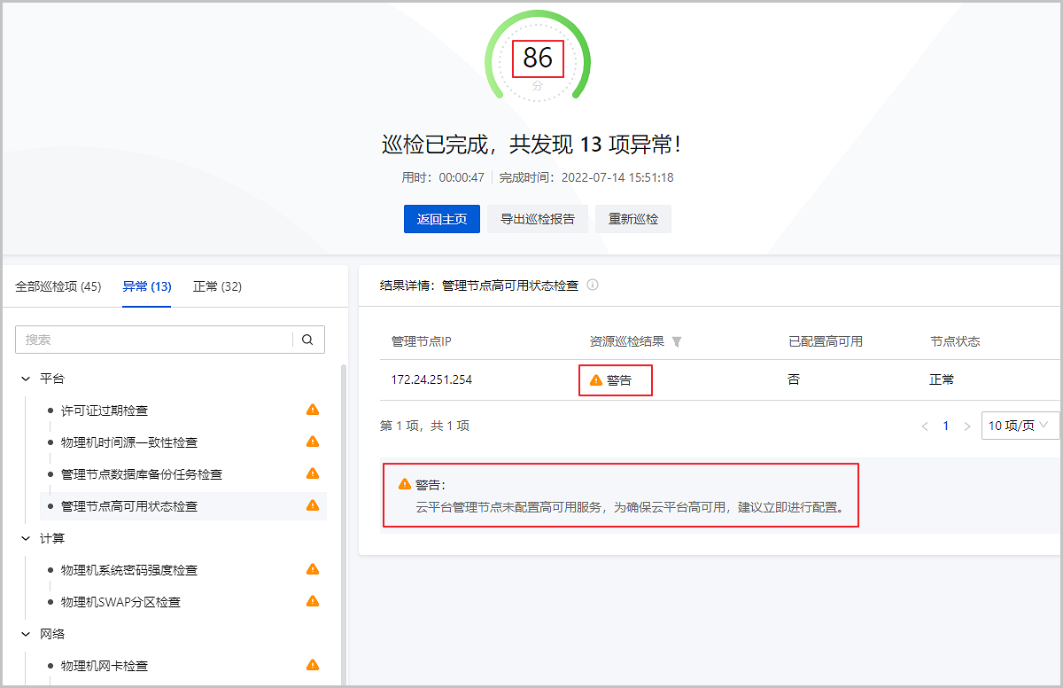 巡检完毕会立即给出健康评分、具体巡检结果以及巡检建议。