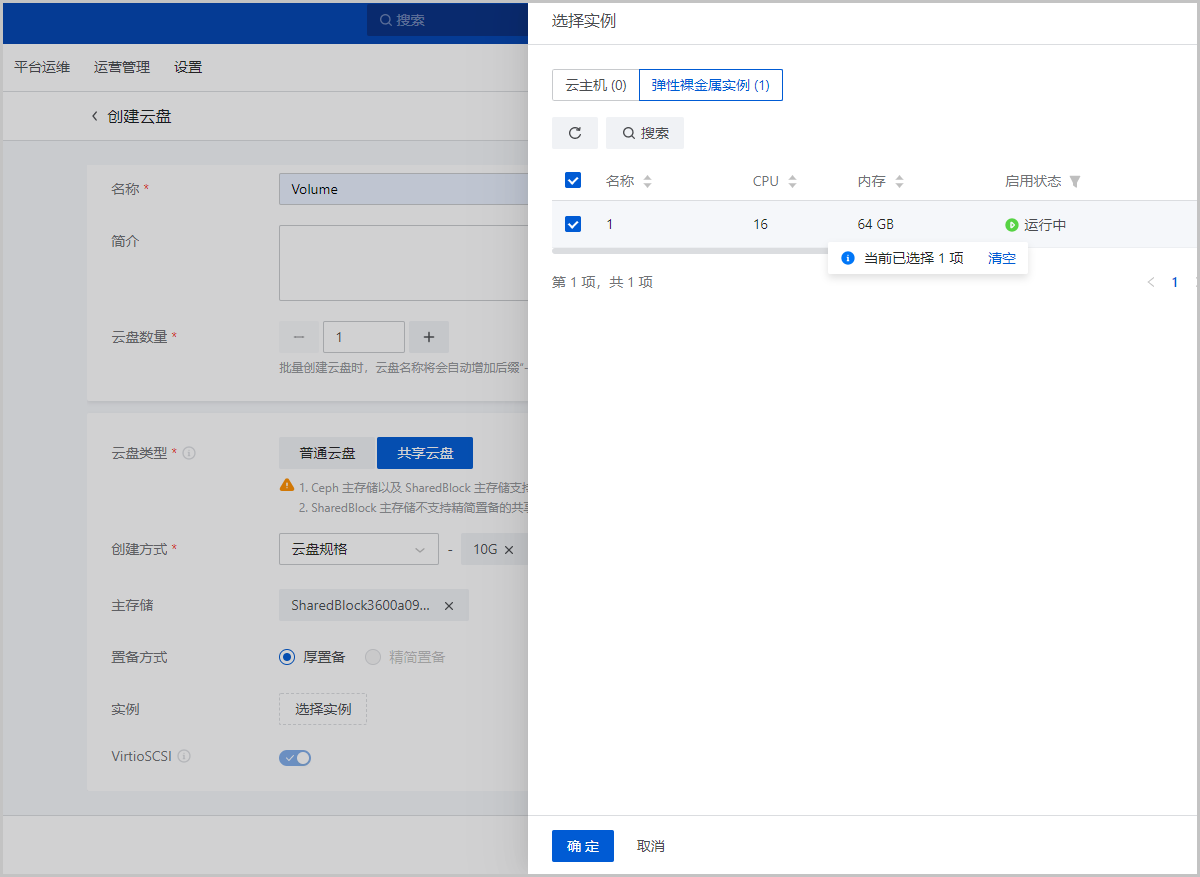 目前Shared Block和Ceph存储场景支持创建共享云盘,共享云盘可同时加载至弹性裸金属实例以及业务云主机,共享存储空间。