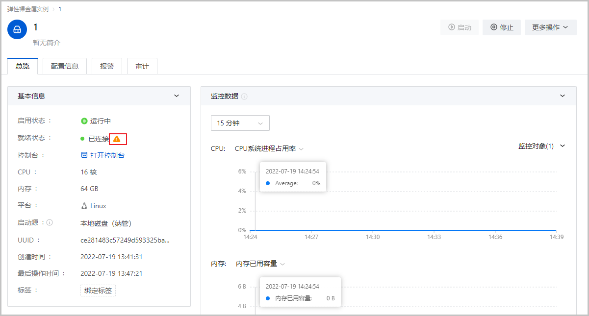 若弹性裸金属实例已安装agent,支持自动检测agent版本。若检测到agent版本过低,UI界面会及时给出提醒,并告知相应升级方法。