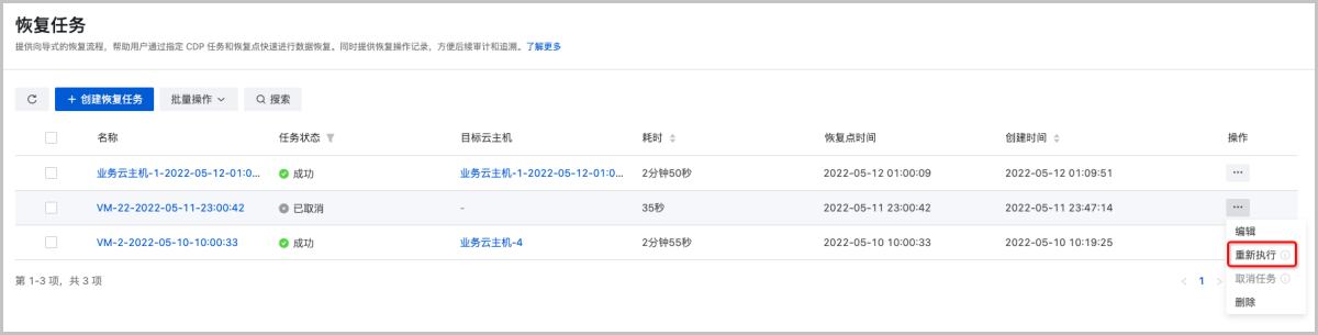 在恢复任务失败或取消的情况下,支持一键重新执行,整个恢复过程更加可视可控。