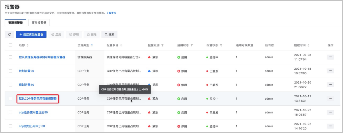 ZStack Cloud 4.3.6新增“默认CDP任务已用容量报警器”,同时支持为CDP任务创建资源报警器和事件报警器,实时监控CDP任务的健康状况并告警,方便运维人员及时响应并定位解决问题。
