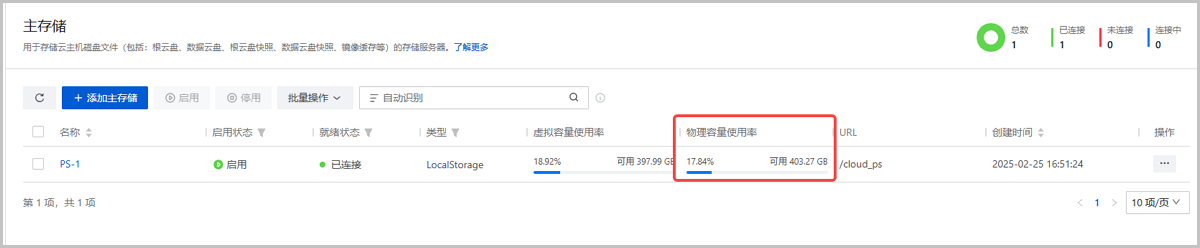 ZStack Cloud 5.3.28开始,主存储列表直观展示物理容量使用率,帮助用户及时发现存储空间不足的风险,并提前采取应对措施,避免故障发生。