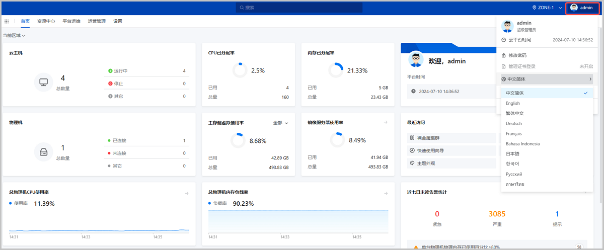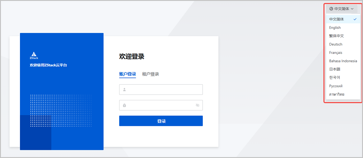 在之前版本中,ZStack Cloud UI已提供简体中文、英文两种语言选项,支持用户按使用习惯灵活切换。