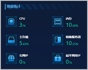 通过对所选虚拟化、区域中数据中心的相关物理资源使用情况进行统计分析,挑选出CPU、内存、主存储、镜像服务器、私网IP、公网IP、GPU、vGPU等资源,对它们的资源用量分别进行实时展示监控,实时显示的比例结合进度条的蓝、黄、红三色提示可直观告知用户当前资源的使用量。