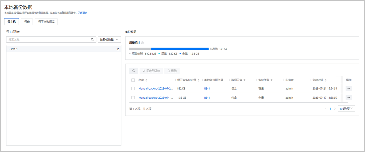 在ZStack Cloud主菜单,点击,进入本地备份数据界面,可查看本地备份数据。
