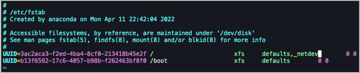 cp /boot/efi/EFI/centos/grubx64.efi /boot/efi/EFI/BOOT/BOOTX64.EFIsystemctl stop NetworkManager && systemctl disable NetworkManagerscp /opt/zstack-dvd/x86_64/h84r/bm2_agents/zstack-bm-agent-x86_64.bin $Linux_IP:/root #$Linux_IP 为Linux云主机的IP地址 bash zstack-bm-agent-x86_64.binvim /etc/fstab ... defaults,_netdev