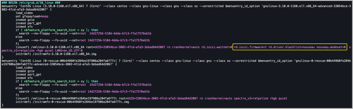#查看修改后的grub.cfg文件 cat /boot/efi/EFI/centos/grub.cfg ... crashkernel=auto rd.iscsi.firmware=1 rd.driver.blacklist=nouveau nouveau.modeset=0
