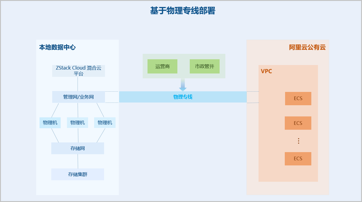 ZStack Cloud混合云平台,结合了ZStack Cloud 私有云的简单、健壮、弹性、智能以及阿里云公有云的领先、安全、稳定等特点,以云+端的形式提供了一套无缝集成的混合云管理方案,实现了混合云真正意义上的控制面和数据面互联互通。