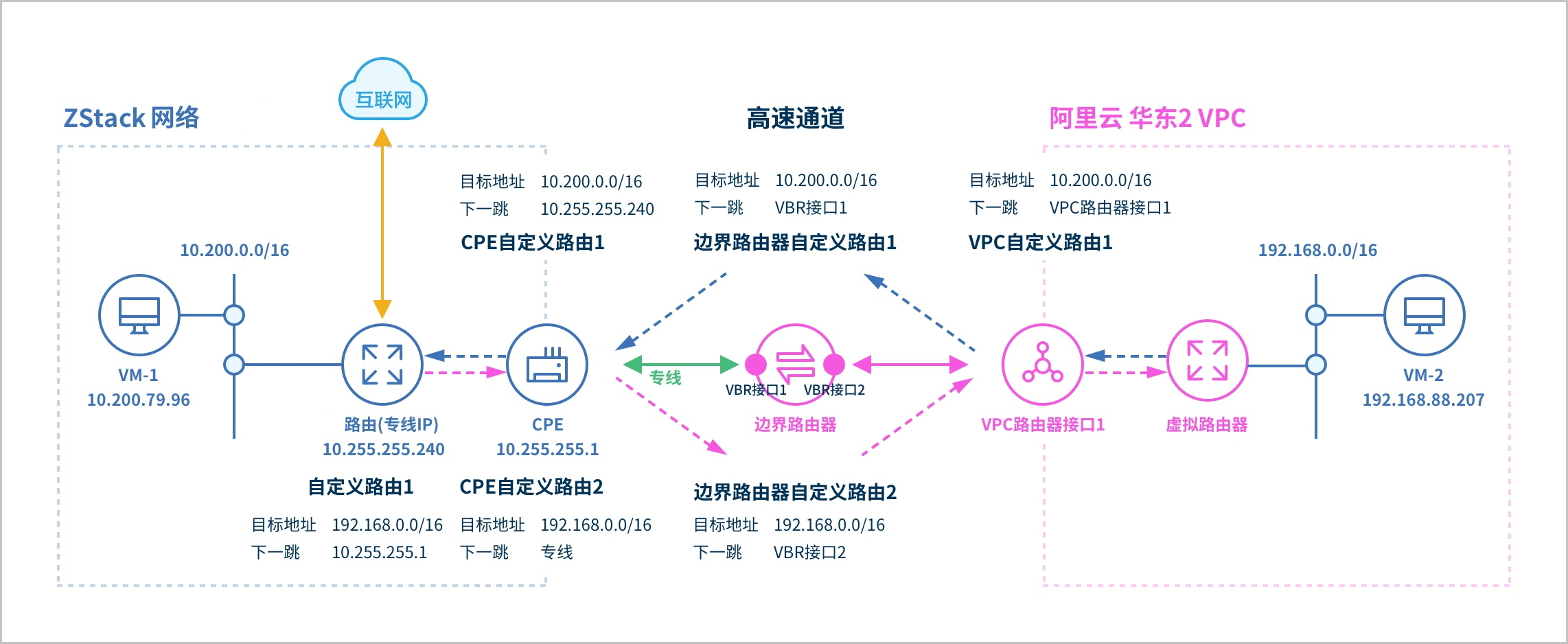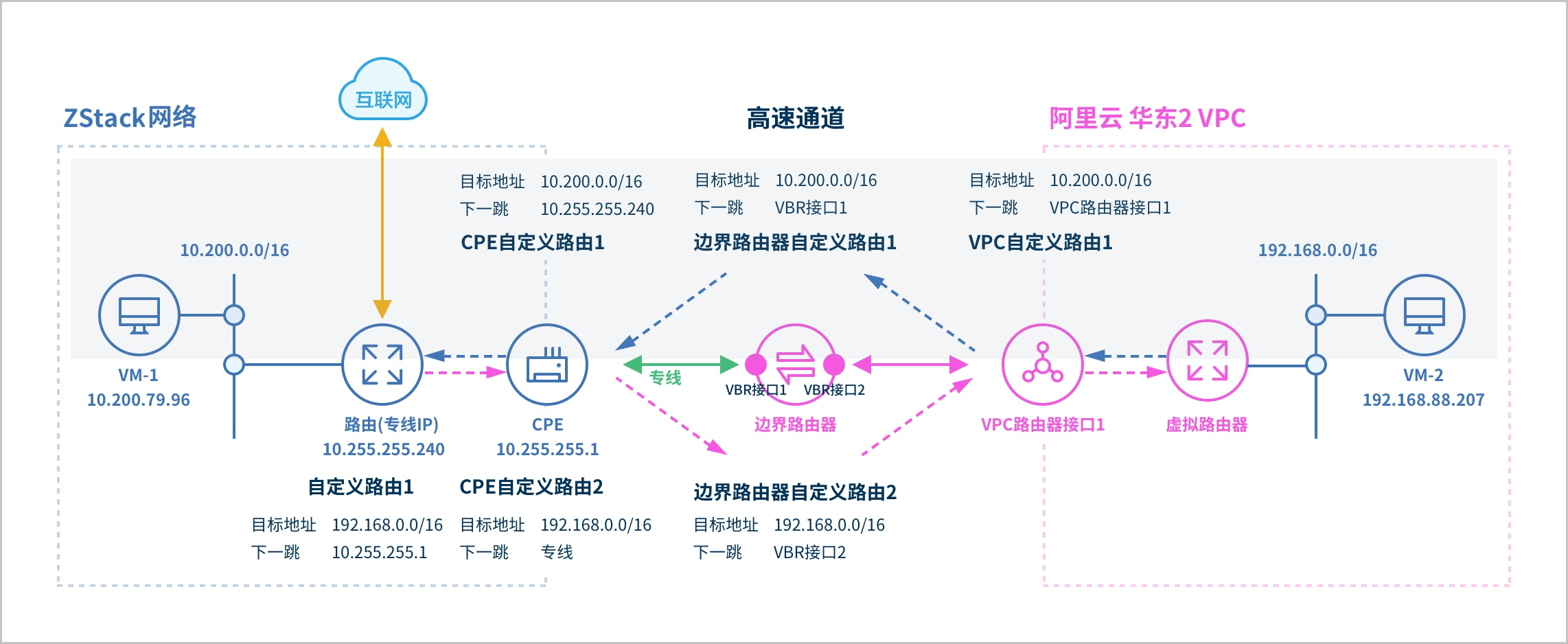 ZStack Cloud支持阿里云高速通道方式实现本地VPC网络与阿里云VPC网络的互通。