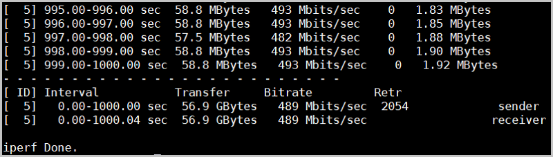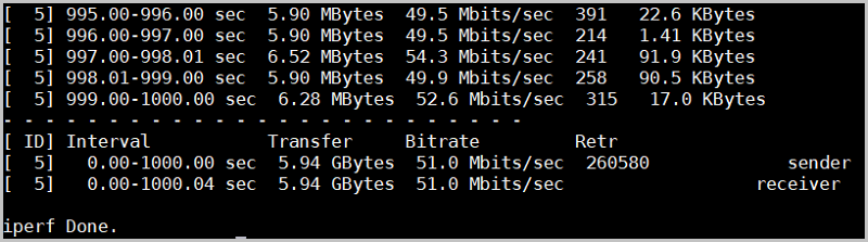 iperf3 -s,在发送端命令行输入 iperf3 -c x.x.x.x(接收端IP地址) -i 1 -t 1000,查看展示的带宽速度,如图 3所示: