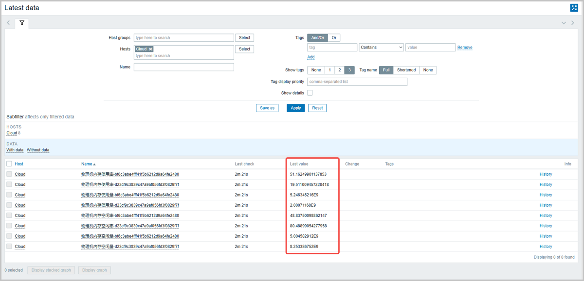 绑定完成后,在ZABBIX主菜单,点击,在Hosts界面,选择ZStack Cloud对应的主机,并查看其Items列,可以发现系统已根据模板发现规则和监控项原型,为ZStack Cloud中的每台物理机各生成了4条监控项。