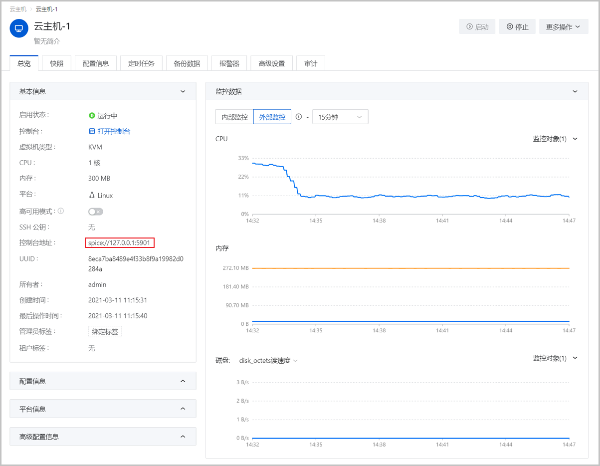 • ZStack Cloud环境上,点击云主机名称,查看控制台地址,如图 2所示: