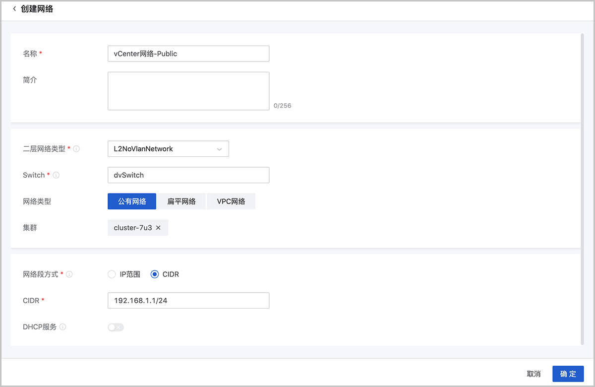 | 添加网络段 | 给vCenter网络添加网络段。IPv4 类型的公有网络支持地址池功能,可同时添加普通网段和地址池网段。扁平网络和VPC网络仅支持普通网段。 |