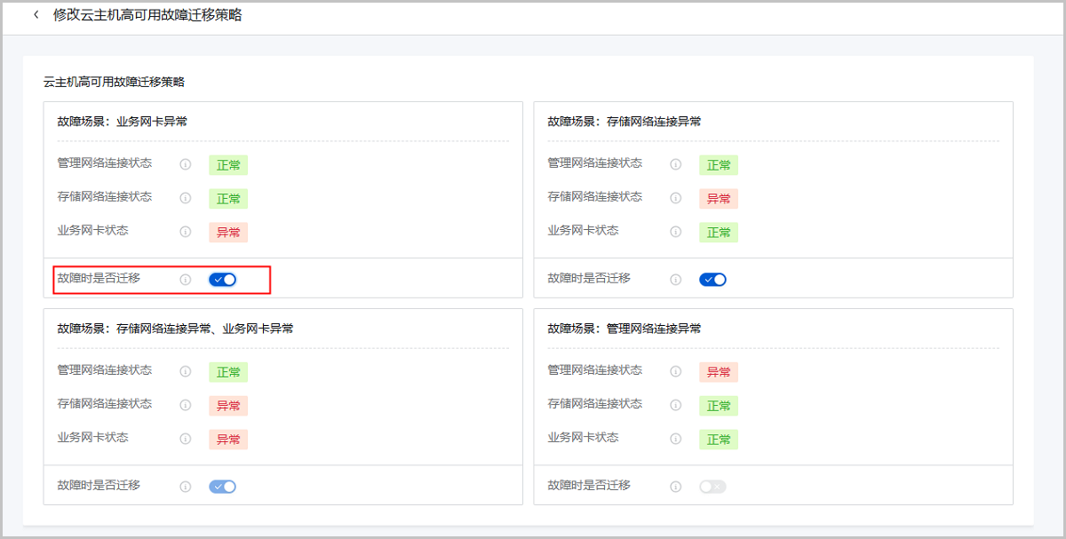 场景假定:用户在物理机Host A上部署4台业务云主机承载MySQL数据库服务,要求物理机Host A业务网卡故障时,所有4台云主机迁移至其他物理机,以保障业务高可用。此场景下,可将这些云主机高可用模式均设置为NeverStop,且设置业务网卡状态故障时触发迁移,并确保云平台内物理机资源充足。