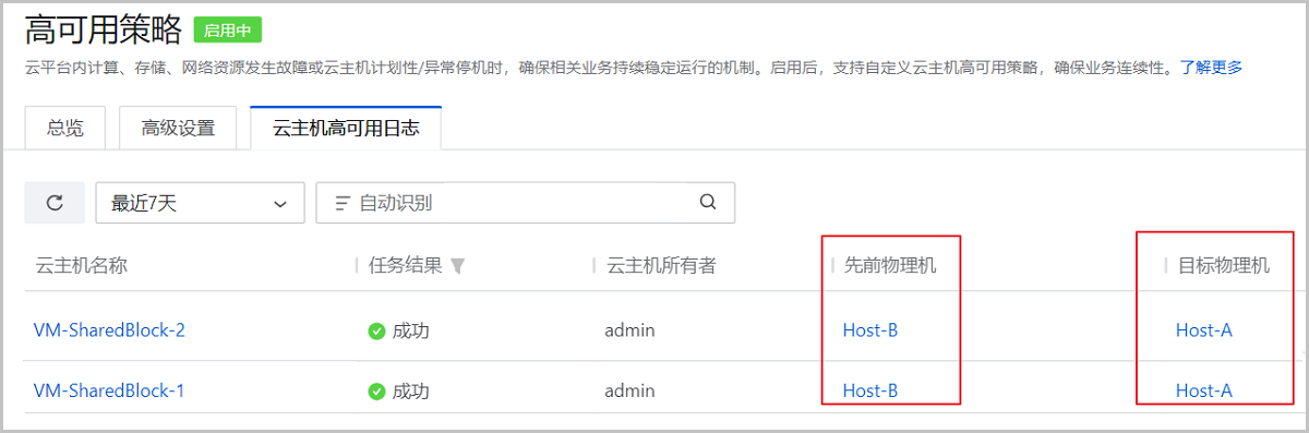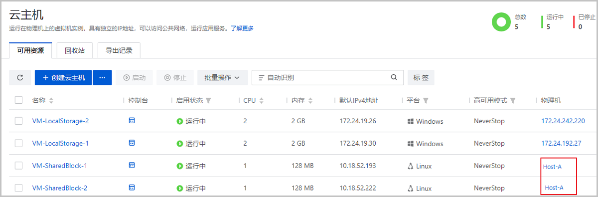 云主机VM-SharedBlock-1和VM-SharedBlock-2部署在物理机Host-B上,云主机数据存储在SharedBlock主存储中。物理机Host-B掉电后,这两台云主机在物理机Host-A上高可用启动。