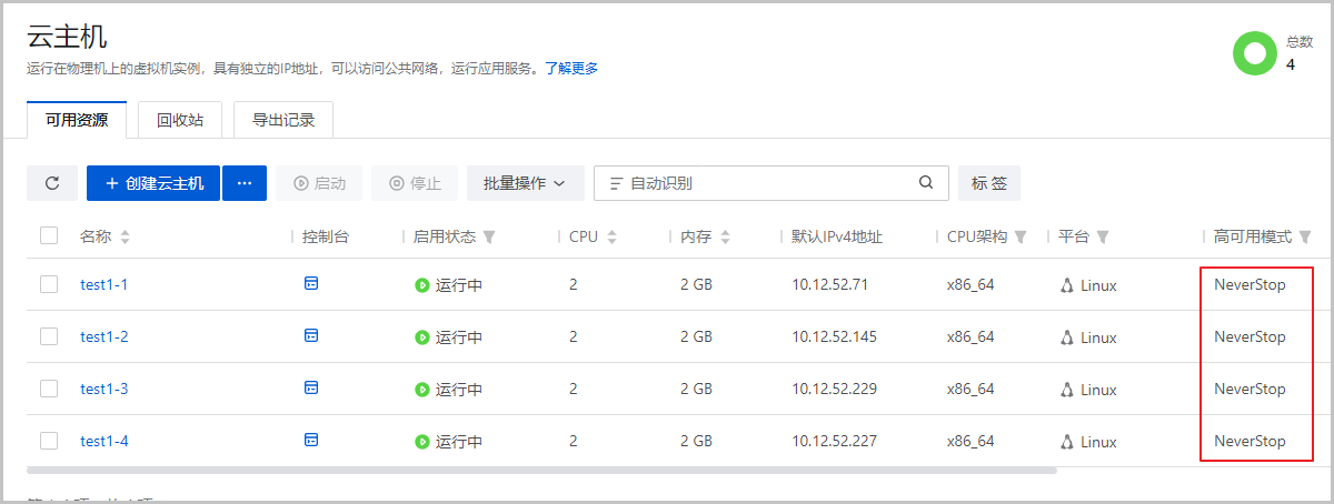 场景假定:用户部署4台云主机运行公司重要业务,其中2台云主机部署在SharedBlock存储上,2台部署在本地存储上。要求任意一台云主机异常停机(例如,物理机掉电、云主机过载等各类因素导致云主机停机)后能自动重启,以保障业务连续性。
