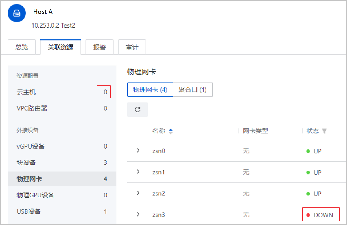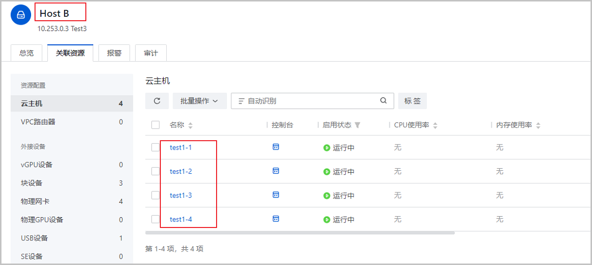云主机高可用策略配置完成后,物理机Host A业务网卡zsn3发生故障。此时,该物理机上的4台云主机立刻自动迁移至物理机Host B上启动。