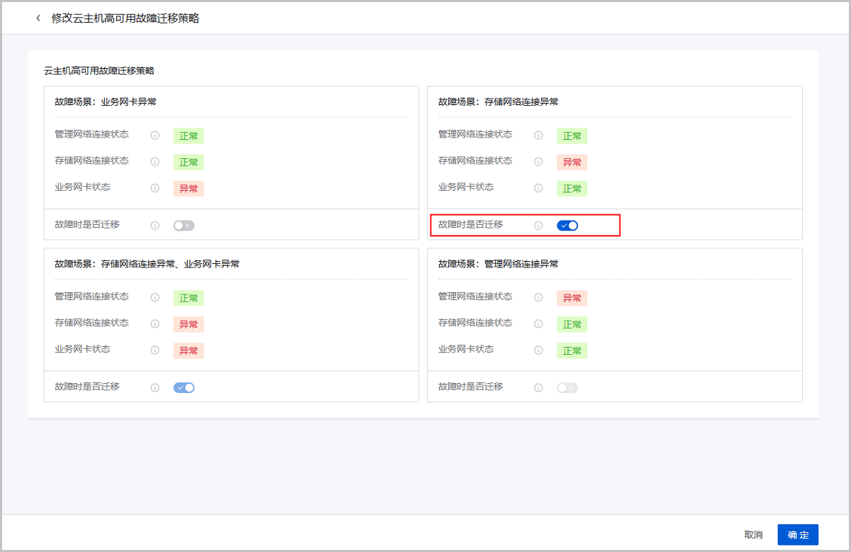 2. 配置云主机故障迁移策略:将故障场景:存储网络连接异常中的故障迁移开关开启,同时,故障场景:存储网络连接异常、业务网卡异常的故障迁移开关将自动开启。