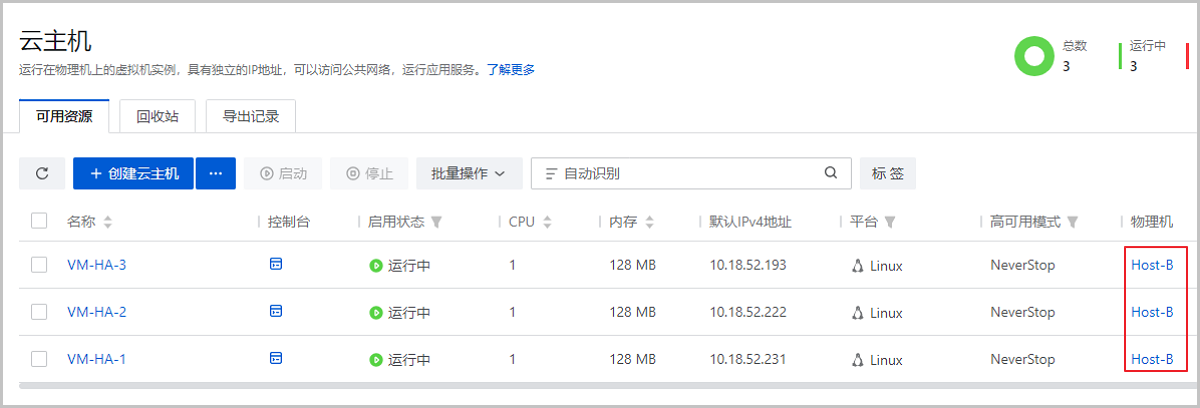 云主机高可用策略配置完成后,物理机Host A与Ceph存储网断开。此时,该物理机上的3台云主机立刻自动迁移至物理机Host B上启动。