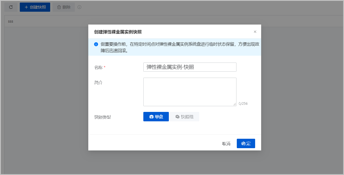 在ZStack Cloud主菜单,点击,进入弹性裸金属实例界面。选择某一弹性裸金属实例,点击,弹出创建云主机快照界面。