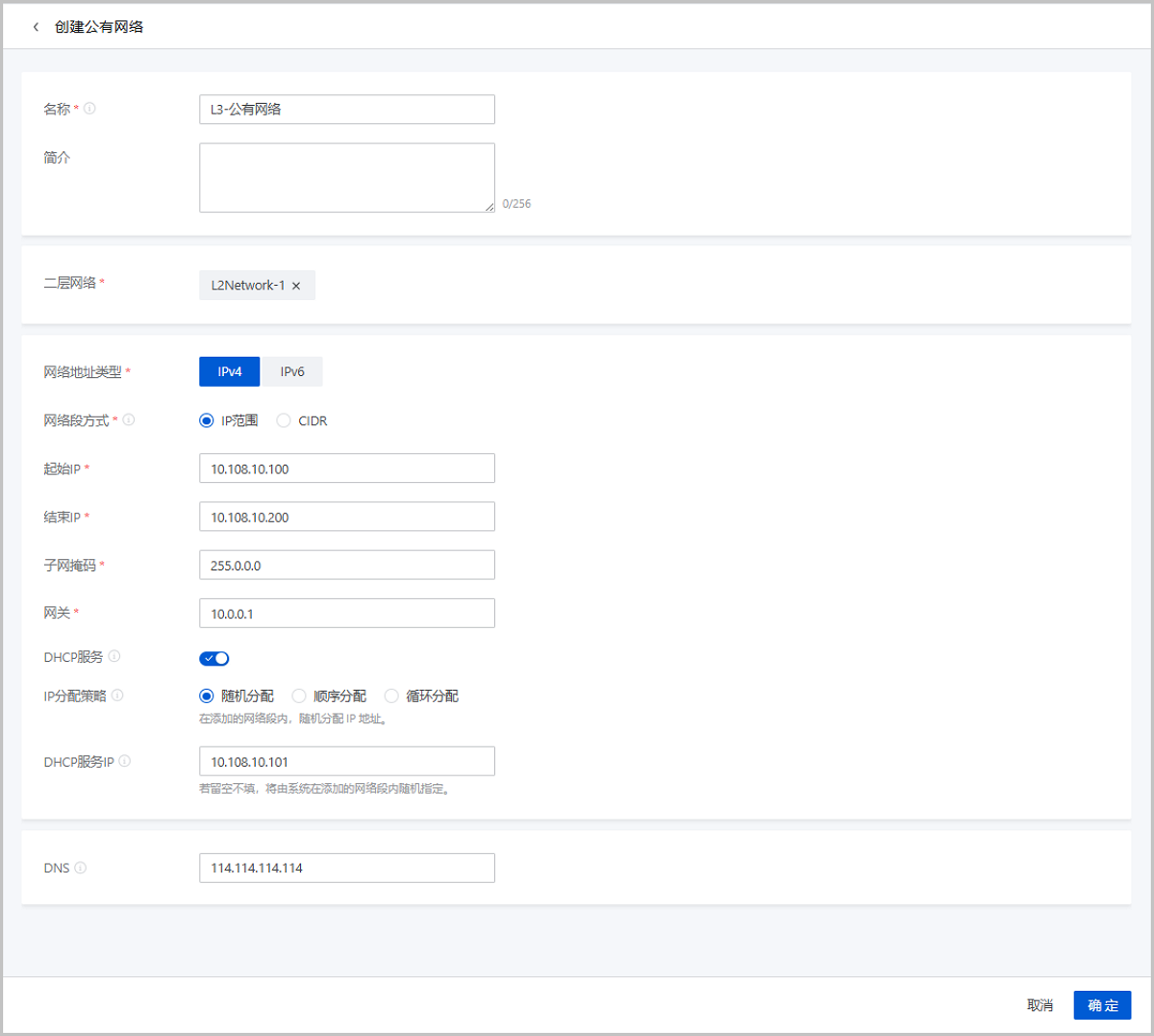 请参考公有网络配置信息创建三层公有网络。