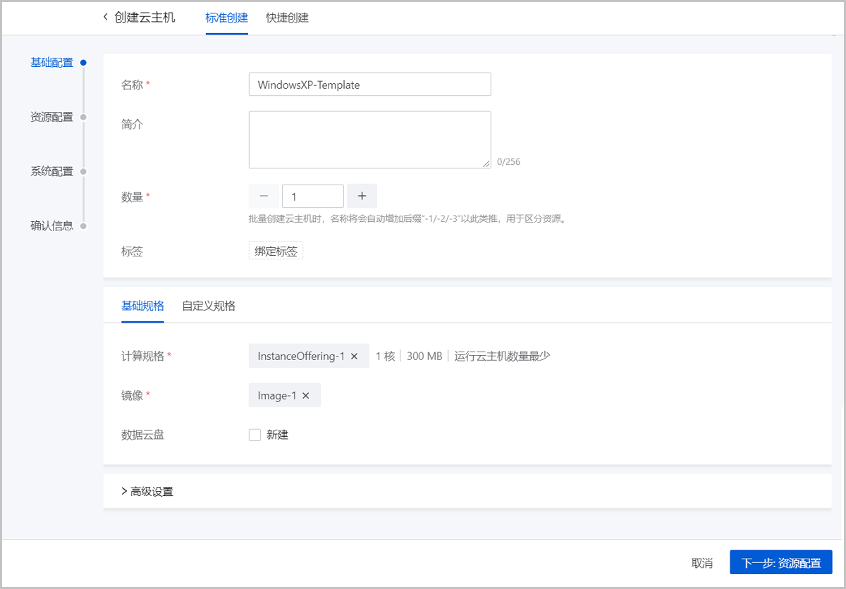 使用添加的Windows XP镜像和网卡驱动镜像创建云主机并安装操作系统。