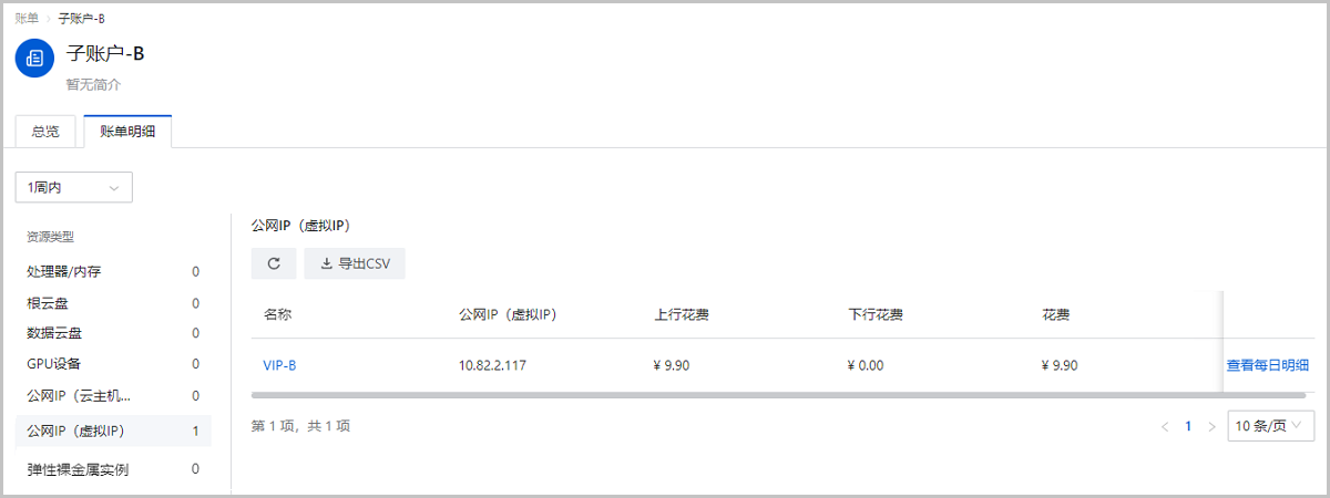 项目/账户支持指定资源查看账单明细,点击资源账单后面的查看每日明细即可查看。